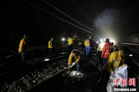 作业人员在普速京广线军田至银盏坳区间进行机械换枕施工作业。王星 摄