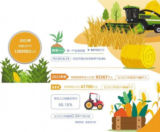 城乡关系演变主要有以下三个趋势。一是农业增加值占国内生产总值(GDP)的比重不断下降,农业从业人员持续减少。1978年第一产业增加值占GDP比重为27.7%,2022年这一比重下降到7.3%。在此过程中,农业从业人员数量也在不断下降,1978年第一产业就业人员占比为70.5%,2022年这一比重下降到24.1%。大量农村富余劳动力和农村人口转移进城,工业化、城镇化快速推进。二是劳动力就业结构变化催生农民工群体。工业化、城镇化对农村富余劳动力产生的虹吸效应,以及农业现代化发展产生的挤出效应,催生了农民工群体。这一群体仍是农村居民,但从事的职业几乎都是第二、三产业,表现出身份特征和职业特征的二元性。三是城镇化水平和质量稳步提升。经过多年的经济快速增长,我国步入工业化的中后期阶段,工业增速趋缓、结构趋优,城镇化发展产生的巨大需求成为推动发展的重要动力。1978年至2023年,我国城镇人口从17245万人增长到93267万人,常住人口城镇化率从17.92%增长到66.16%。户籍制度改革持续深化,城区常住人口300万以下城市的落户限制基本取消,城区常住人口300万以上城市的落户条件有序放宽,城乡发展格局不断优化。